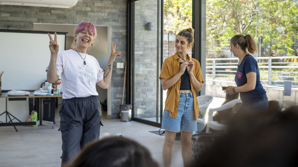 Primero, volvimos a nosotres. Tuvimos un ejercicio para sentir nuestros cuerpos, para movernos y anclarnos en el presente, para saber que estábamos viviendo el aquí y el ahora.
