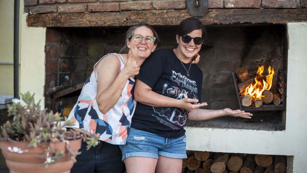 Y al caer la tarde… ¡llegó el momento cumbre! Subimos a una terraza divina donde charlamos, nos tomamos fotos y… ¡encendimos el fogón! Literalmente. Fue un momento mágico. Compartimos una cena deliciosa todes juntes y, como broche de oro, ¡partimos y compartimos el pastel de cumpleaños de nuestra queridísima Nicole!